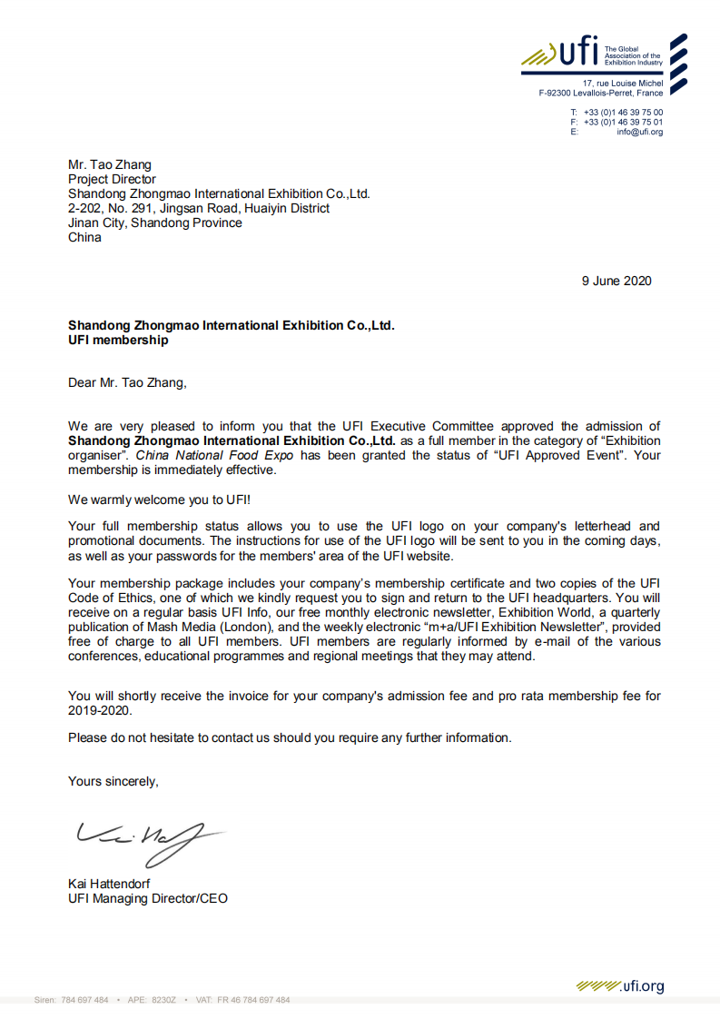 2020年6月9日,UFI(全球展覽業(yè)協(xié)會(huì))巴黎總部傳來喜訊:中法合資高博中貿(mào)會(huì)展在山東、江蘇、安徽主辦的CNFE全國食品博覽會(huì)(濟(jì)南)、CNWFF中國(南京)國際糖酒食品交易會(huì)、CAWFF中國(安徽)國際糖酒食品交易會(huì)三展同時(shí)通過UFI(全球展覽業(yè)協(xié)會(huì))認(rèn)證,同時(shí)高博中貿(mào)會(huì)展在山東、江蘇、安徽三個(gè)子公司也通過UFI評(píng)審委員會(huì)的表決,分別正式成為UFI(全球展覽業(yè)協(xié)會(huì))會(huì)員單位。通過UFI認(rèn)證,是國際會(huì)展行業(yè)對(duì)主、承辦單位組織辦展能力的肯定,對(duì)展會(huì)在國際化、專業(yè)化、品牌化運(yùn)營方面的充分認(rèn)可。借助UFI認(rèn)證展會(huì)的權(quán)威和影響,努力提升展會(huì)平臺(tái)新高度,助推會(huì)展經(jīng)濟(jì)的快速發(fā)展。