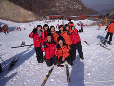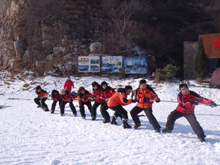 來到滑雪大廳,第一個(gè)步驟就是換裝:換上滑雪服和滑雪鞋,感覺自己就像是太空人,一切都是那么的新奇;滑雪裝備準(zhǔn)備齊全之后,我們進(jìn)入了滑雪場地,剛剛開始感覺舉步維艱,仿佛一不小心就會摔倒在地,但慢慢的我們就會滑上一小步了,我們?yōu)樽约旱男⌒〉倪M(jìn)步而歡呼雀躍。爾后,我們在杜總和劉總的帶領(lǐng)下爬上了雪坡,在掌握了一些滑雪技巧之后,我們開始陸續(xù)的往下滑,去體驗(yàn)俯沖的刺激、摔倒的驚險(xiǎn)和同事間互相幫助的喜悅,在經(jīng)歷了不計(jì)其數(shù)的摔倒、爬起再摔倒的循環(huán)后,每個(gè)人都掌握了滑雪的基本技巧,其中,劉總、張存、李萍作為技巧最好的代表,每一次的俯沖都贏得了大家的掌聲和贊嘆。滑雪就像是做展覽,剛開始感覺很陌生,慢慢的掌握了技巧,每個(gè)人都會在自己的領(lǐng)域游刃有余,只要你努力、堅(jiān)持、不斷的探索,相信每一個(gè)中貿(mào)人都會在中貿(mào)的大環(huán)境下打拼出屬于自己的一片天地。上午的時(shí)間就在滑雪的緊張和喜悅中悄然而逝,中午我們在金象山餐廳中領(lǐng)略了農(nóng)家特色菜肴的美味。稍事的休息之后,我們開始了下午的活動,首先我們進(jìn)行了拔河比賽,一、二組為一隊(duì)由李總領(lǐng)隊(duì),三、四組為一隊(duì)由劉總作為領(lǐng)隊(duì),總裁判由杜總擔(dān)任。先是進(jìn)行了一場熱身賽,我們一隊(duì)保存了實(shí)力,二隊(duì)獲勝。真正的比賽開始了,在先失一局的情況下,李總總結(jié)教訓(xùn),讓三位男士朱峰、張存、張章到最前面,女士在后,一隊(duì)一鼓作氣,贏得了2、3局,最終一隊(duì)以2:1的比分贏得了比賽,每個(gè)人都意猶未盡,沉浸在團(tuán)隊(duì)協(xié)作的氛圍之中。